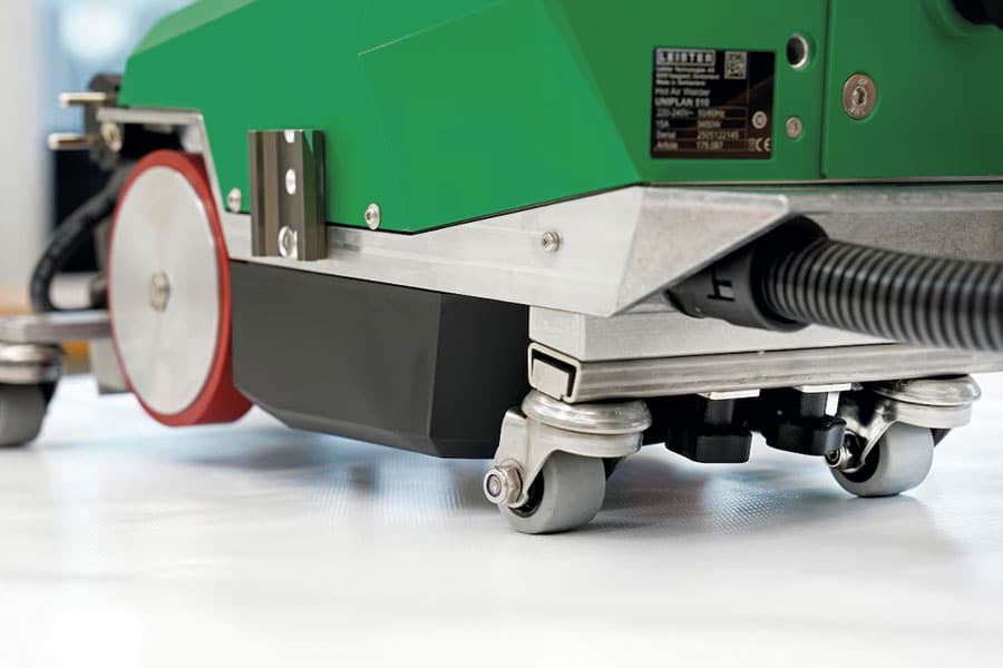 La VARIANT 700 está diseñada para soldadura sobre suelo. En grandes formatos (lonas para camión, frontales y traseras de carpa, coberturas de gran superficie) moverse por el material en el suelo puede ser más eficiente que manipularlo sobre mesa. En España no es tan habitual trabajar así, pero abrir esa puerta puede aportar productividad cuando los tamaños crecen.