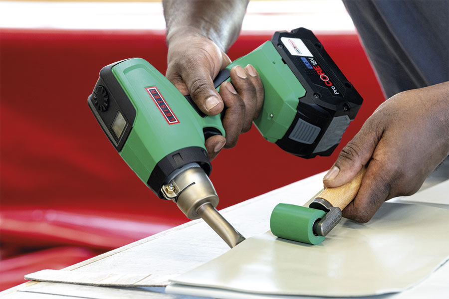 • Temperatura máxima de 500 °C y caudal de aire de 300 l/min: suficiente para calentar y fundir materiales como PVC, TPO o PE con la misma precisión que una herramienta con cable.